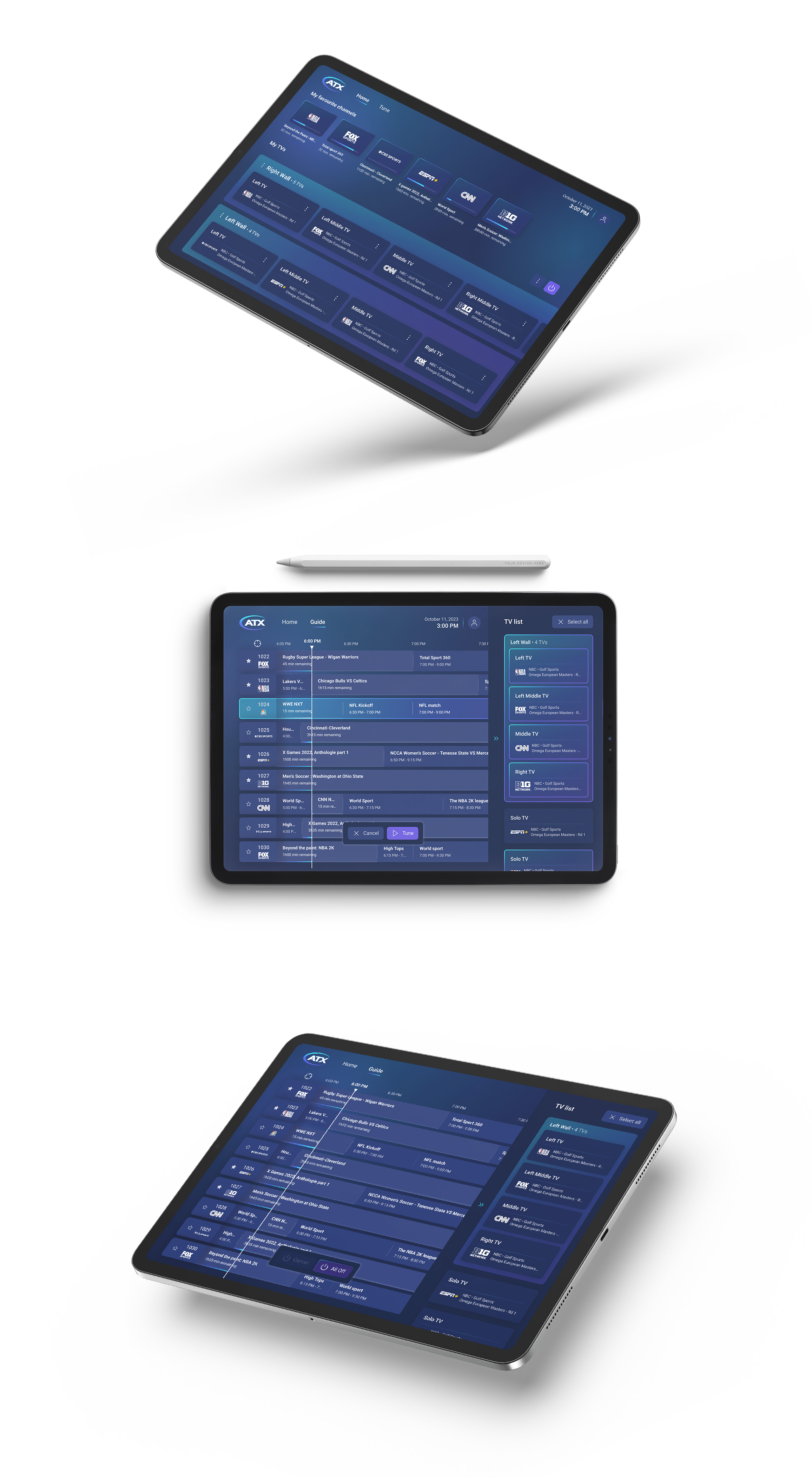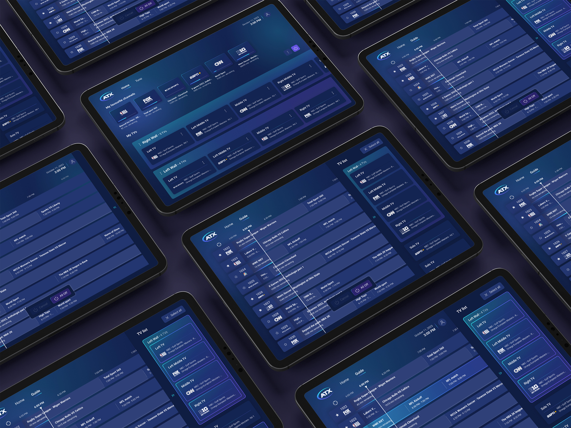 ATX est un fournisseur leader sur le marché des solutions d'accès, de distribution à large bande et des médias. Création d'un outil sur tablette à destination des bars sportifs permettant de contrôler la gestion collective des téléviseurs, y compris les réglages et l'assignation des chaînes. Spécificités techniques : - Possibilité de choisir quelles chaînes sont diffusées sur chaque écran, individuellement ou en groupe. - Identification facile des téléviseurs concernés, afin de syntoniser une chaîne spécifique sur un ou plusieurs écrans ciblés. Création d’une expérience utilisateur intuitive grâce à une interface conviviale et facile à prendre en main. Mise en place d’un design system incluant un style guide, un fichier fondation et des composants de base.